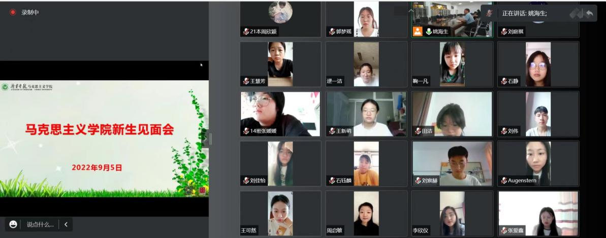 9月5日上午,马克思主义学院通过腾讯会议的形式召开了2022级新生线上见面会。该院党委书记樊海涛,辅导员姚海生,在校学生代表和思想政治教育专业2022级全体新生参加线上见面会并进行了互动交流。