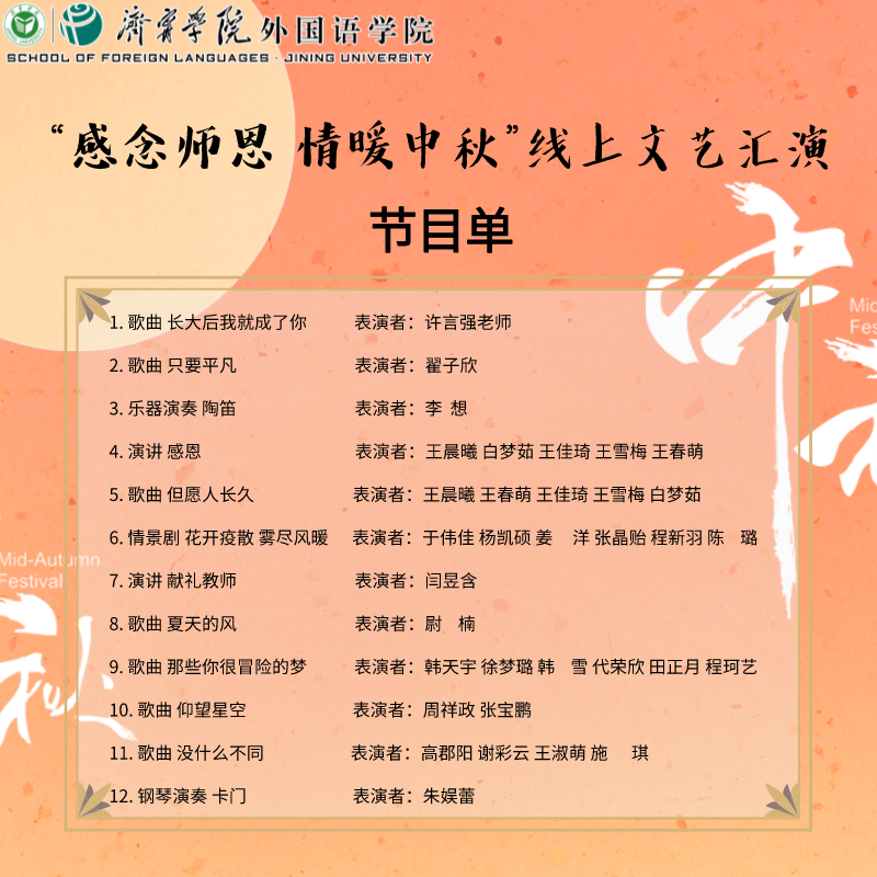 此次线上汇演活动不仅让同学们敞开心扉,互相了解,增进感情,同时也增强同学们的家国情怀,拉近了师生距离,丰富了校园文化生活,更让大家感受到了学院和学校给予的温暖,将以更好的状态投入学习和生活。“青山一道同风雨,明月何曾是两乡”,线上的相会是为了更早的拥抱,同在一轮明月之下,外国语学院师生双节同庆,欢乐共享,相信在学校的坚强领导下,师生必将齐心协力,共同创造学校美好的未来。