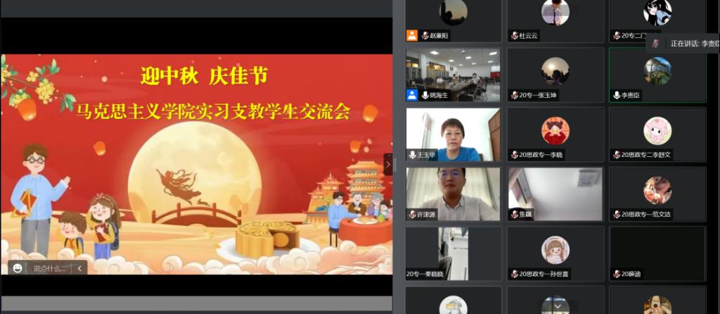 为进一步了解实习支教学生的生活和工作情况,送上学院领导、老师中秋佳节的祝福和关怀,9月10日上午,马克思主义学院通过腾讯会议的形式举办了“迎中秋 庆佳节 马克思主义学院实习支教学生交流会”。学院党委书记樊海涛、院长王玉华、实习指导老师、思想政治教育专业2020级专科班实习支教学生参加了线上交流会。交流会由辅导员姚海生主持。