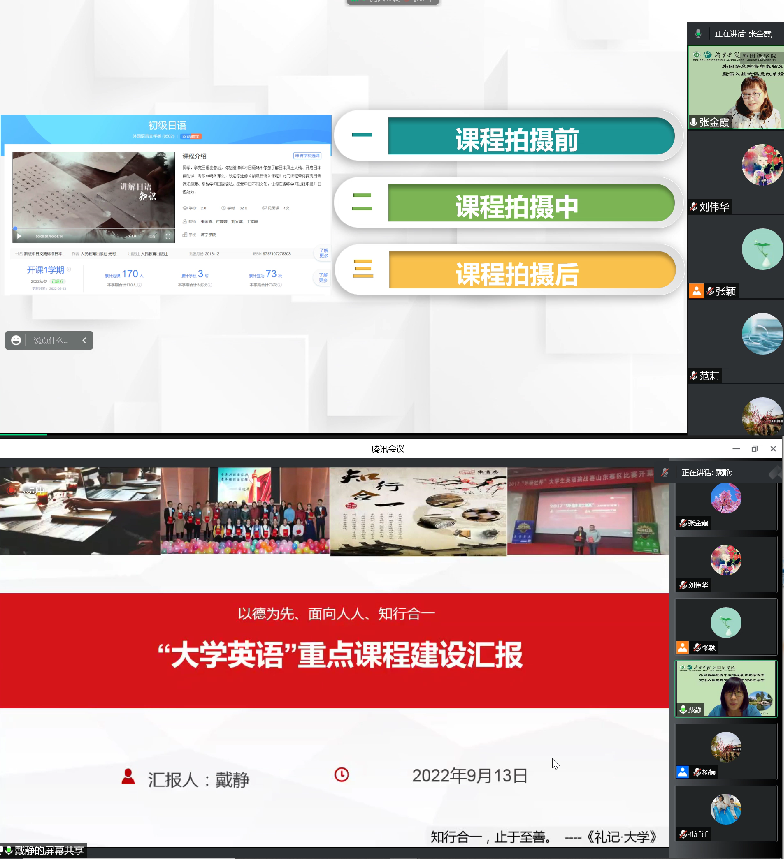 接下来,杨永兵、范莉、张金霞、戴静四位教师分别从山东省联盟在线课程建设、开展线下课堂改革、线上课程无缝对接线下教学等方面进行了精彩的分享。杨永兵老师从“态度决定一切”、“思考课程之锚”、“精心备选资料”、“拍摄注意事项”四个方面回顾了《国际贸易理论与实务》课程的心路历程。他提到,每位教师都应该围绕课堂改革,学生的技能、素养培养和课程影响力提升多琢磨、多思考,不断加强团队合作。范莉老师从“Why、What、How、Summary”四个角度深入浅出分享了省联盟在线课程建设的缘由、内容、途径和心得。她提到《美国文学史》课程2022年上线国家高等教育智慧教育平台以来,目前有500多名社会学习者选学此课程,既发挥了高校服务社会的优势,又扩大了学校的社会影响力。张金霞老师按照课程录制前、课程录制时、课程录制后的时间主线,梳理了《初级日语》课程的建设新思路。戴静老师以“以德为先,面向人人、知行合一大学英语重点课程建设汇报”为题,通过课程建设的前期探索和具体情况的分析,总结成果,反思不足。她提到课程建设只有进行时没有完成时,是师生共同成长相互成就的过程。随后,全体教师在线上展开了热烈的讨论。