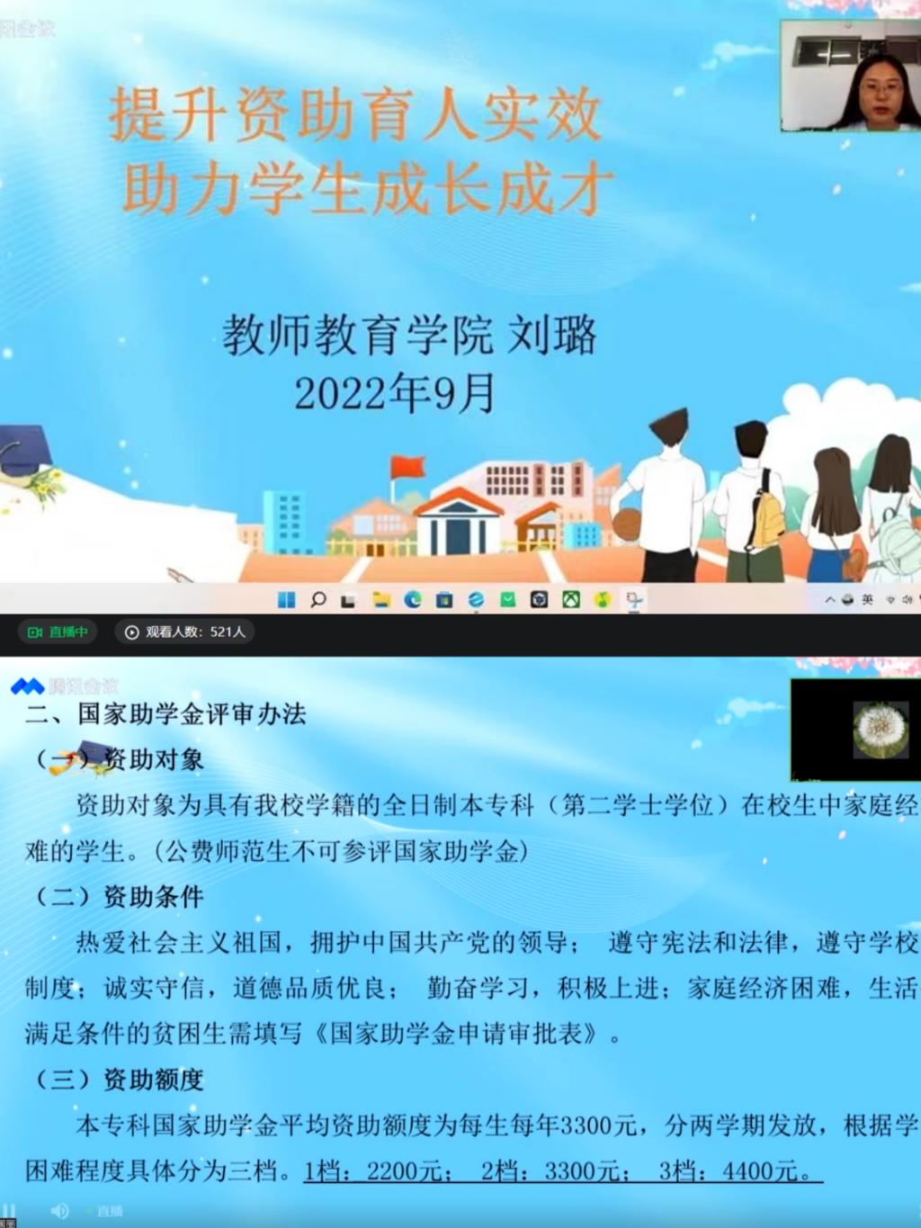 为充分发挥资助育人功能,帮助2022级新生全面了解国家资助相关政策,9月16日上午,教师教育学院以线上形式举行了资助政策宣讲活动。本次活动由该院辅导员刘璐主讲,2022级全体新生参加。