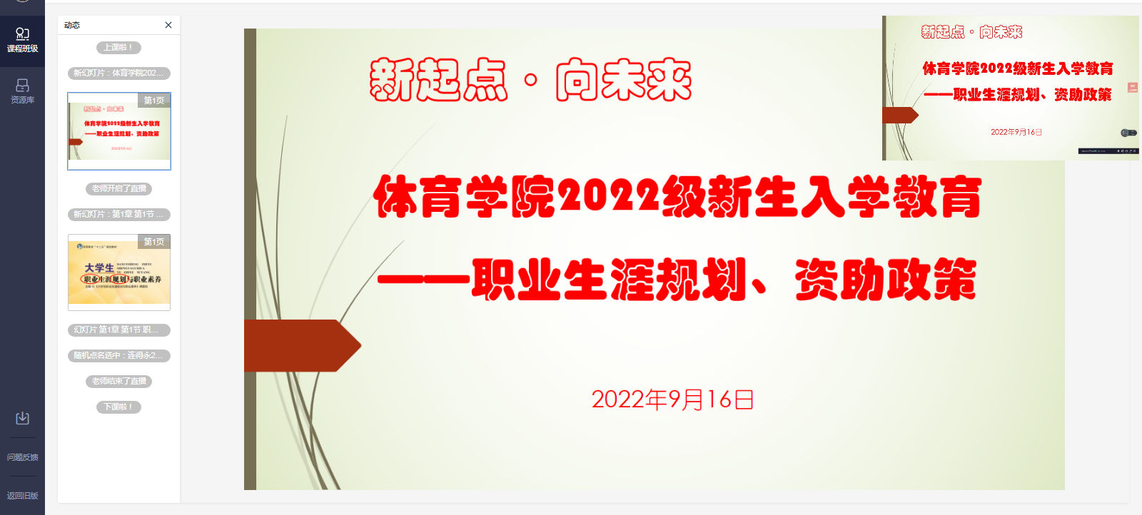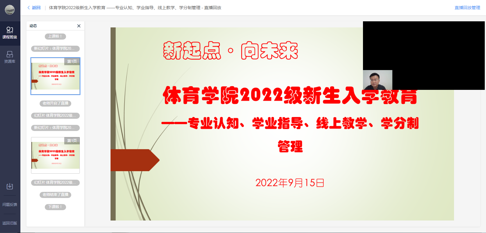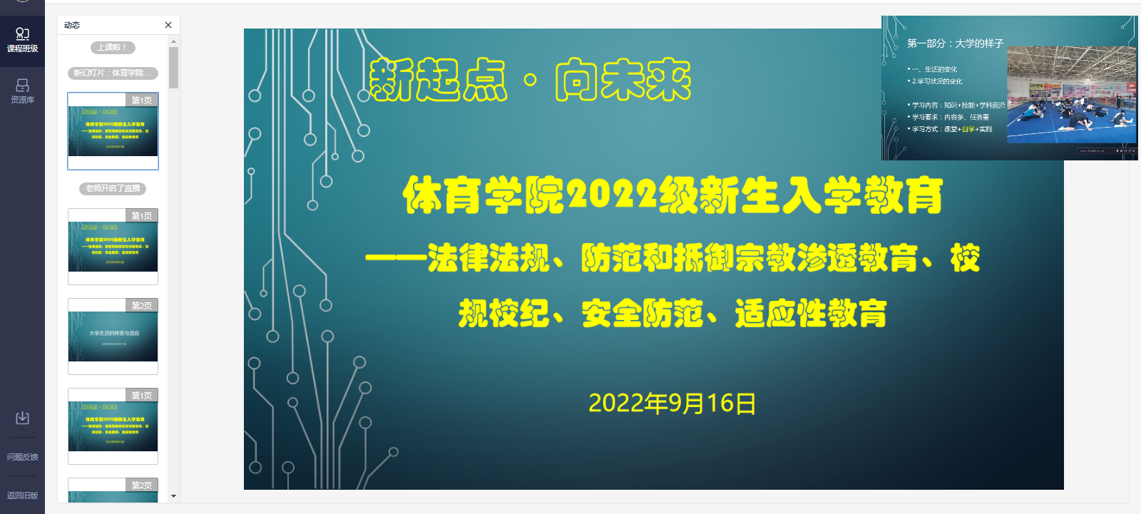 9月14日至16日,体育学院通过雨课堂顺利开展了以“新起点、向未来”为主题的2022级新生入学教育。学院副院长徐刚、党委副书记辛允东及全体辅导员分别为新生作报告。