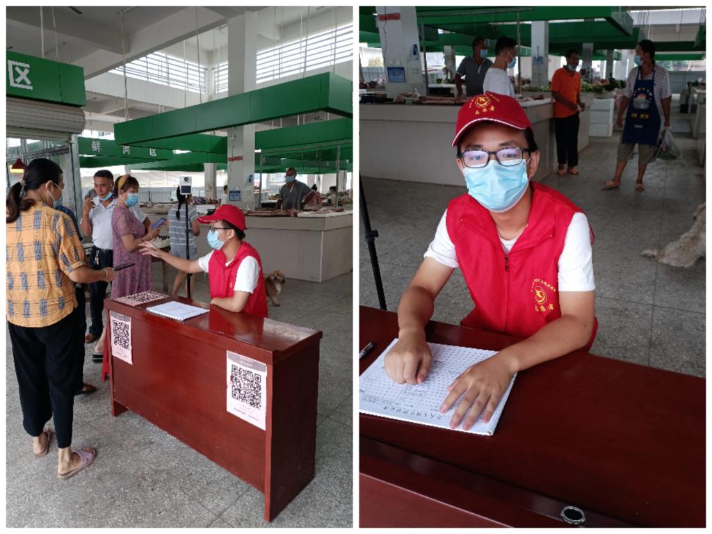 近期江西吉安出现本土确诊病例,疫情防控号角吹响,当地防疫工作者和热心居民闻令而动,迅速投入到疫情阻击战中。家住吉安县的22级电气夏本班王靓发主动报名,在农贸市场的卡点,统计进出人员,做好登记,测量体温。
