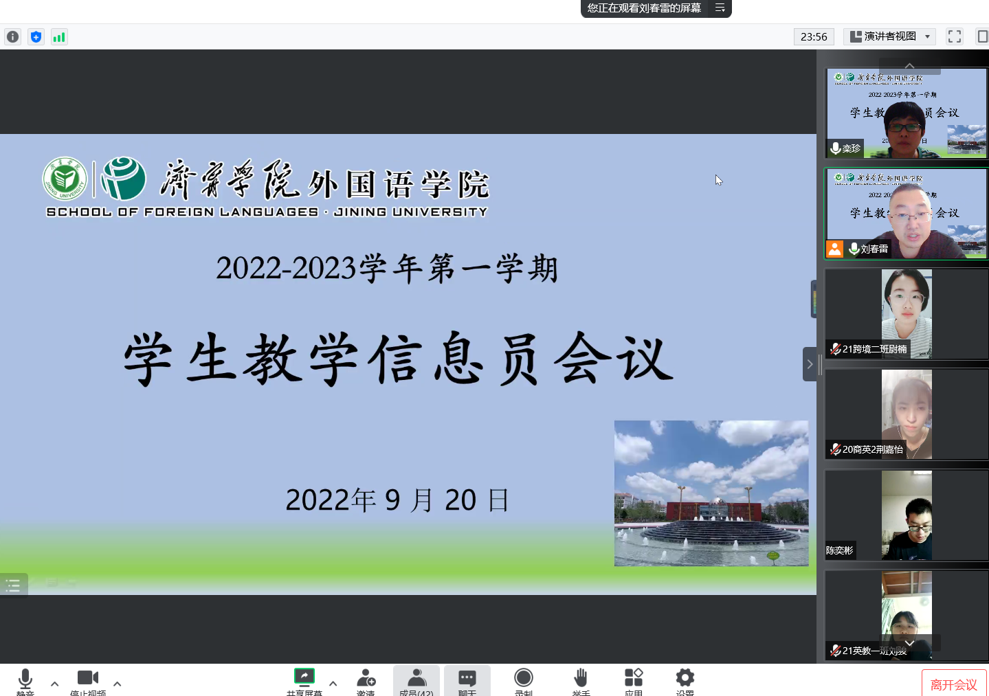 9月20日晚,外国语学院通过腾讯会议在云端召开学生教学信息员会议。会议由教学秘书栾珍、刘春雷主持,2019-2021级学生教学信息员以及2022级新生各班班助同学参加此次会议。