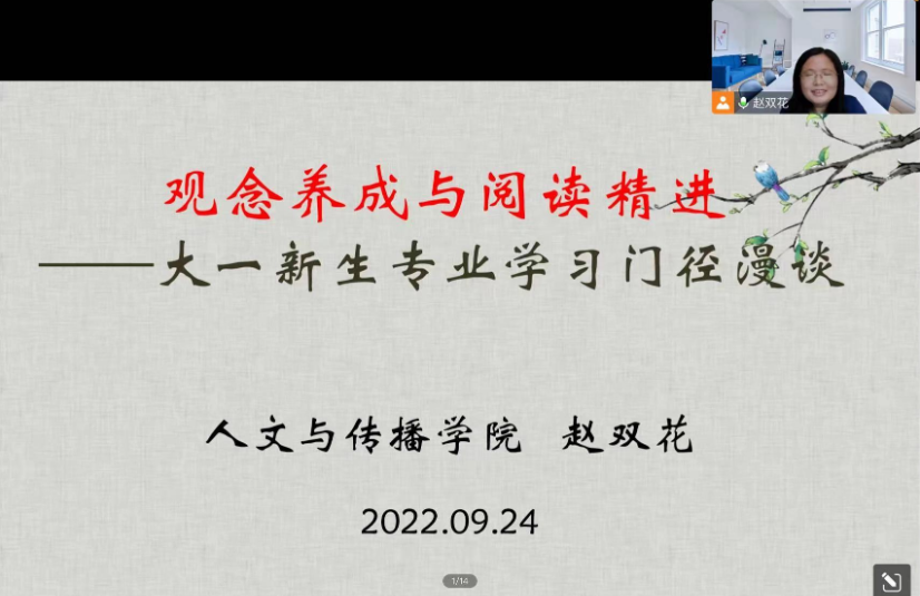 9月24日,人文与传播学院通过线上形式举办“观念的养成与阅读精进——大一新生专业学习门径漫谈”专题讲座。本次专题讲座由文学博士赵双花教授主讲,人文与传播学院党委书记卫建勋、辅导员肖洁以及2022级全体新生参与本次讲座。