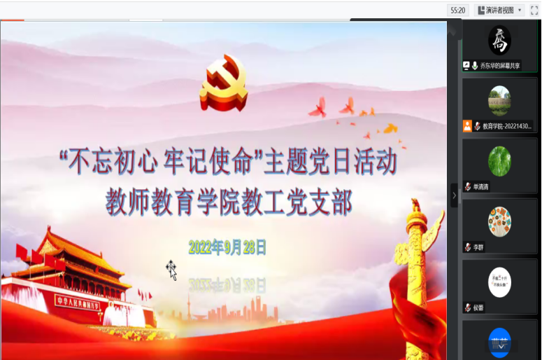 为喜迎党的二十大召开,落实学校党委工作要求,9月28日下午,教师教育学院教工党支部以线上线下相结合的方式开展“不忘初心、牢记使命”主题党日活动。会议由教工党支部书记赵国丽主持,全体教工党员参加。