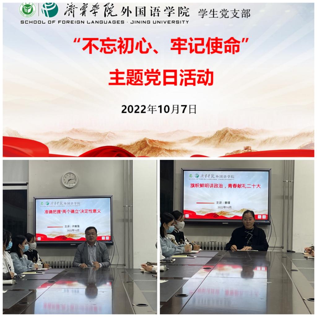 为迎接党的二十大胜利召开,进一步增强基层党组织的组织力、凝聚力和战斗力,发挥党员先锋模范作用,10月7日下午,外国语学院学生党支部在A110会议室开展“不忘初心、牢记使命”主题党日活动。活动由学生党支部书记姜璨主持。