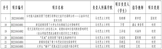 10月6日,学校公布了《2022年亚星在线登录官网大学生研究性学习与创新性实验计划项目暨国家级、省级创新创业训练计划项目》立项名单,马克思主义学院推荐的6个项目全部成功立项。其中商学哲老师指导的,由张晓娜、韩晓林、丁善睿、宋磊、王泽铭组成的学生团队申报的“乡村振兴战略背景下党建引领带动文旅开发调研分析——以曲阜市武家村为例”项目被教育部确定为2022年国家级大学生创新创业训练计划项目,其余5个项目列入亚星在线登录官网大学生研究性学习与创新性实验计划项目。