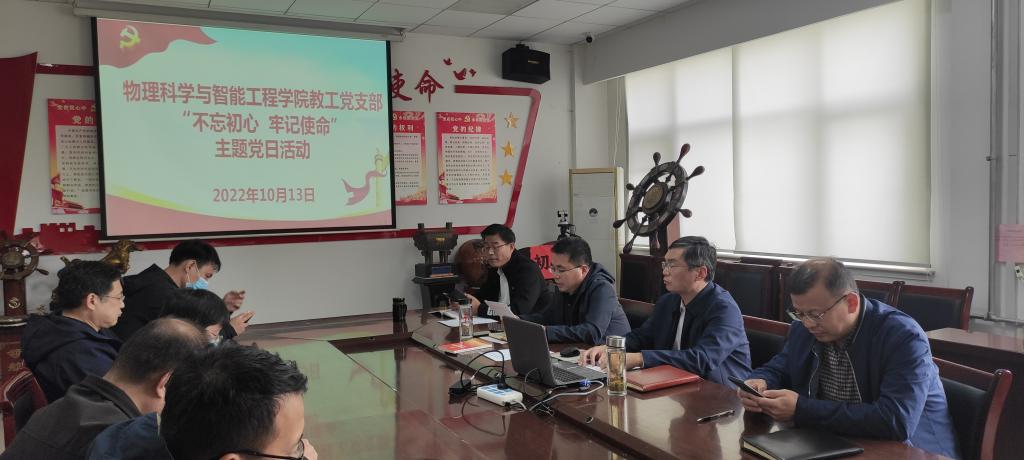 为迎接党的二十大胜利召开,进一步增强基层党组织的组织力、凝聚力和战斗力,发挥教师党员先锋模范作用,激发干事创业热情,10月13日下午,物理科学与智能工程学院教工党支部在学院党员活动室开展了“不忘初心、牢记使命”主题党日活动。