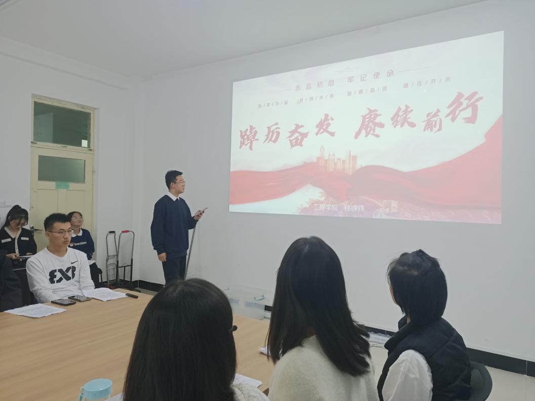 为加强新时代国防教育,激发青年大学生关心国防、热爱国防、建设国防、保卫国防的热情,引导青年学生厚植家国情怀,10月23日晚,工程学院在8号楼C209会议室举行“爱我国防”主题演讲比赛。此次比赛由该院团委副书记肖文婷主持,辅导员朱海成、贾艳丽及学生会主要干部担任本次比赛评委。