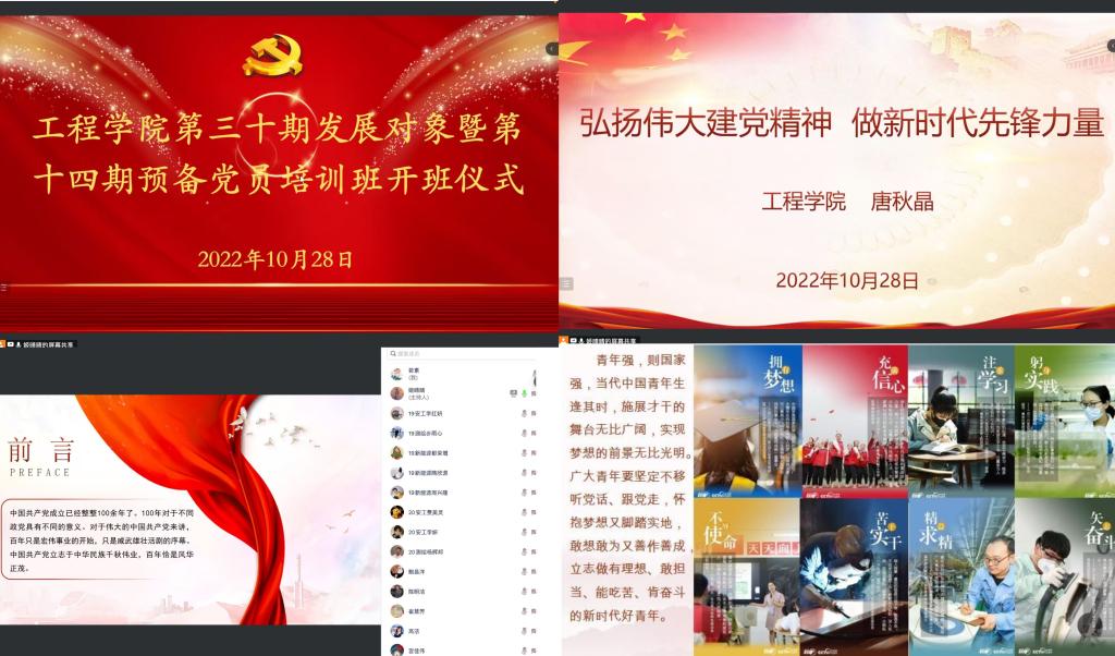 为进一步提升学生党员教育培养质量,扎实推进党建工作开展,10月28日,工程学院第三十期发展对象暨第十四期预备党员培训班正式开班。本次开班依托腾讯会议进行,8名发展对象及34名预备党员参加,该院党委书记唐秋晶以“弘扬伟大建党精神,做新时代先锋力量”为题,为全体学员上了一堂内容丰富的党课。