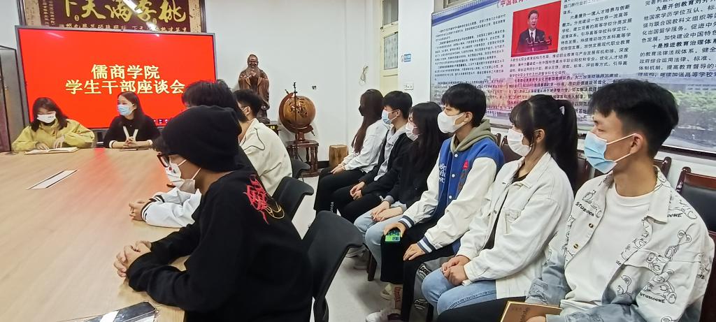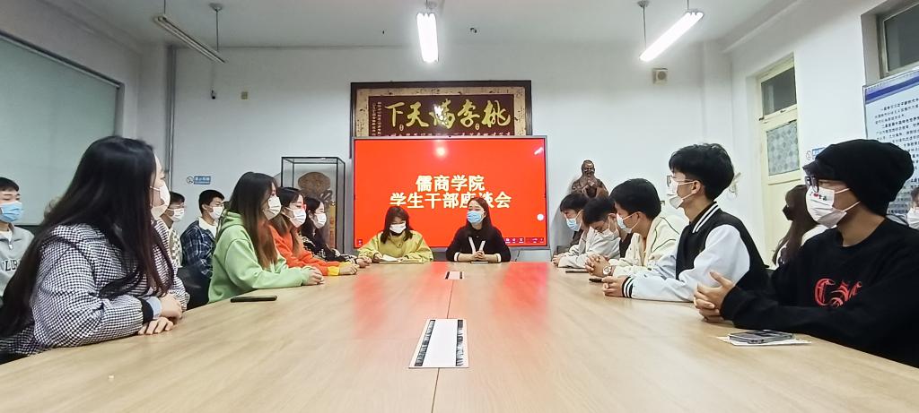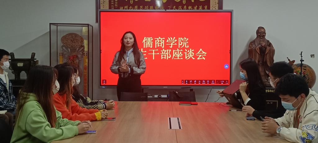 10月31日,儒商学院在3号楼B308会议室召开学生干部座谈会。儒商学院团委副书记袁芬、辅导员张俞、学生会主席团成员、各部门负责人代表以及全体2022级新生班长、团支书参与本次会议。