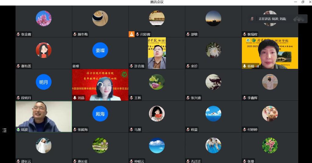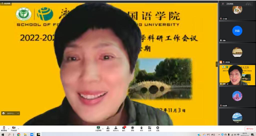 数树深红出浅黄,教学育人日渐忙。11月3日晚,外国语学院召开2022-2023学年第一学期期中教学科研工作会议暨教师发展沙龙第六期活动。该院党委书记陆波、院长杨楠、副院长张殿海、张颖、院长助理刘晶以及全体教职工通过腾讯会议参加,本次活动由刘晶主持。