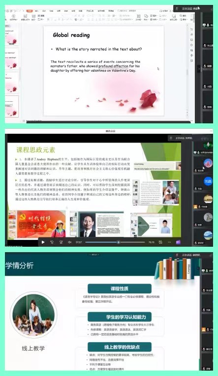 专题分享讲座后,本周公开课主讲教师陈静、刘翠莲、薛妍妍三位老师针对主讲《综合英语Ⅰ》、《大学英语Ⅲ》、《语言学导论》课程依次分享了各自的教学设计和教学反思,她们或用产出导向设计教学,或用连麦、雨课堂答题丰富师生互动,或不忘思政育人。随后,学院教学督导、听课教师在线交流听课反馈。