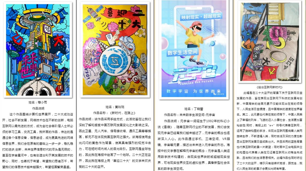 经过前期宣传,同学们踊跃报名参加,共提交近100份参赛作品。同学们围绕“奋进新征程·建功新时代”和“同庆二十大”主题进行海报设计,反复打磨、巧妙构思、精心绘制,或采用ps、ai等绘画软件,或进行手绘,融入云计算、5G、大数据、人工智能等科技热点,将互联网和计算机科技的高速发展,与党的领导下祖国日新月异的发展面貌、人民美好的幸福生活结合在一起,用鲜艳明亮的色彩、奇趣妙想的构思,描绘出科技引领的美好未来,寄情繁荣昌盛的祖国发展。由教师与学生代表组成评委组,从作品的立意、内容、创意、色彩等方面进行评审,共产生一等奖4名,二等奖10名、三等奖8名和若干优秀奖。获奖作品在学院官方微信和抖音平台进行展播。