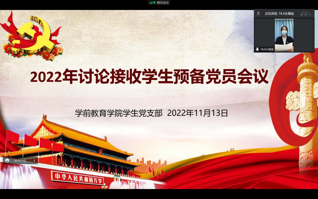 11月13日下午,学前教育学院学生党支部以视频会议的形式召开支部大会,讨论并表决是否接收王倩迪等15名同志为预备党员。学生党支部全体党员、38名入党积极分子、15名发展对象参加了会议。学前教育学院党委委员孙跃朋、季首领同志列席会议。会议由党支部书记丰琳琳主持。