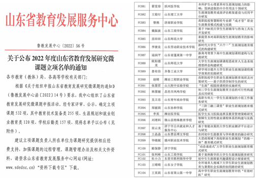 近日,山东省教育发展服务中心公布了“2022年度山东省教育发展研究微课题”立项名单,我校工程学院教师姬保静主持的《“动态递进式”大学生职业生涯规划教育模式研究》课题获批立项。