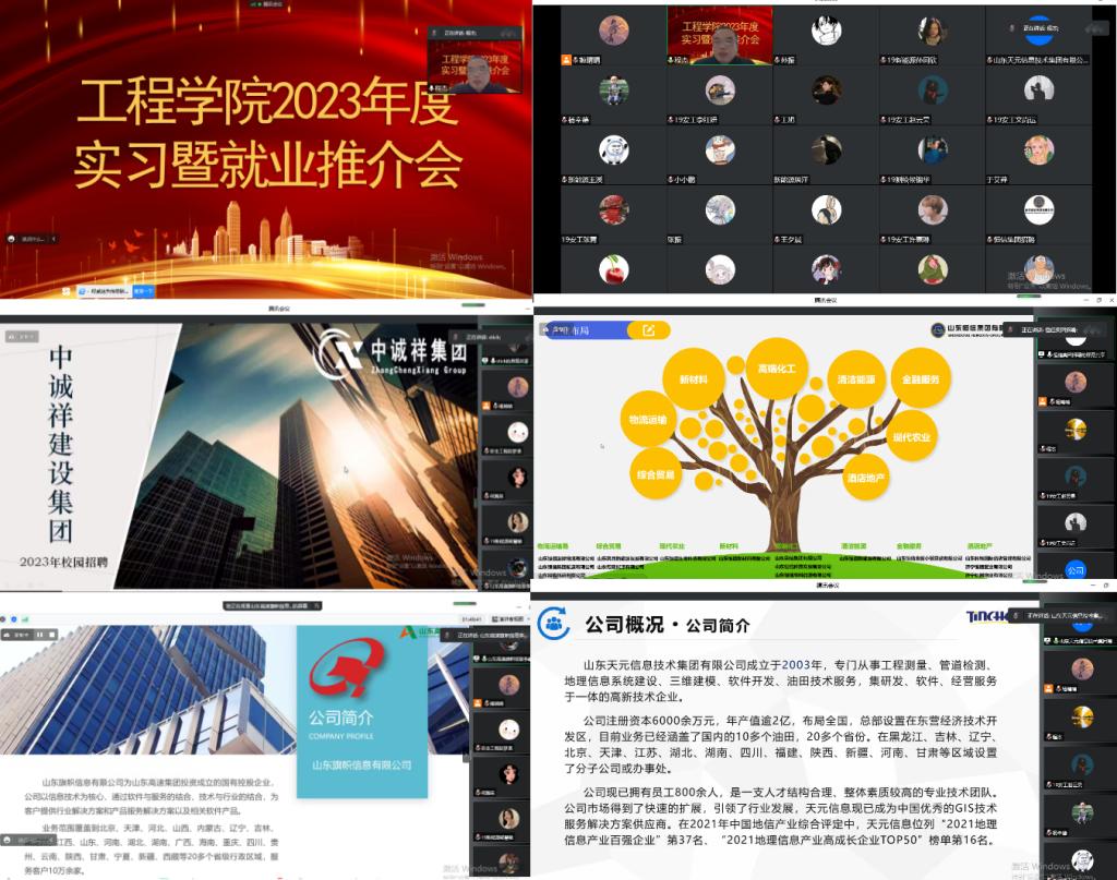 12月30日上午,工程学院2023届毕业生实习暨就业推介会通过腾讯会议平台如期顺利举行。济宁能源发展集团有限公司、山东天元信息技术集团有限公司、山东恒信集团、济宁市勘测院、山东华兴教育科技有限公司等12家单位受邀参加,并介绍了本公司的发展现状、招聘岗位、工作环境、福利待遇等情况,为2023届毕业生提供了200多个实习与就业岗位。工程学院141名应届毕业生认真聆听了宣讲,并通过各种网络渠道踊跃与相关单位进行了沟通,递交了个人简历。