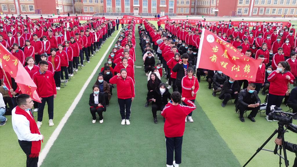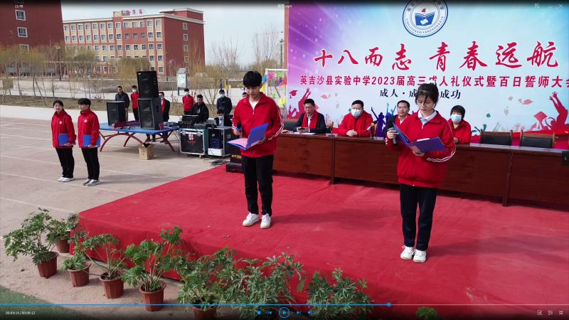 战鼓雷鸣抒壮志,金狮欢腾展豪情。磨砺以须战高考,百炼成钢铸辉煌。3月1日下午,我校援疆实习支教团与英吉沙县实验中学共同举办了2023届高三学生成人礼暨高考百日冲刺誓师大会。我校带队教师郝鹏、孔凡华及实验中学党委书记向本湘、副校长丁守峰等校领导出席活动,我校实习支教团成员、实验中学全体高三学生、家长及班主任、教师代表参加活动。我校孙玉洺、徐天阳同学主持了此次活动。