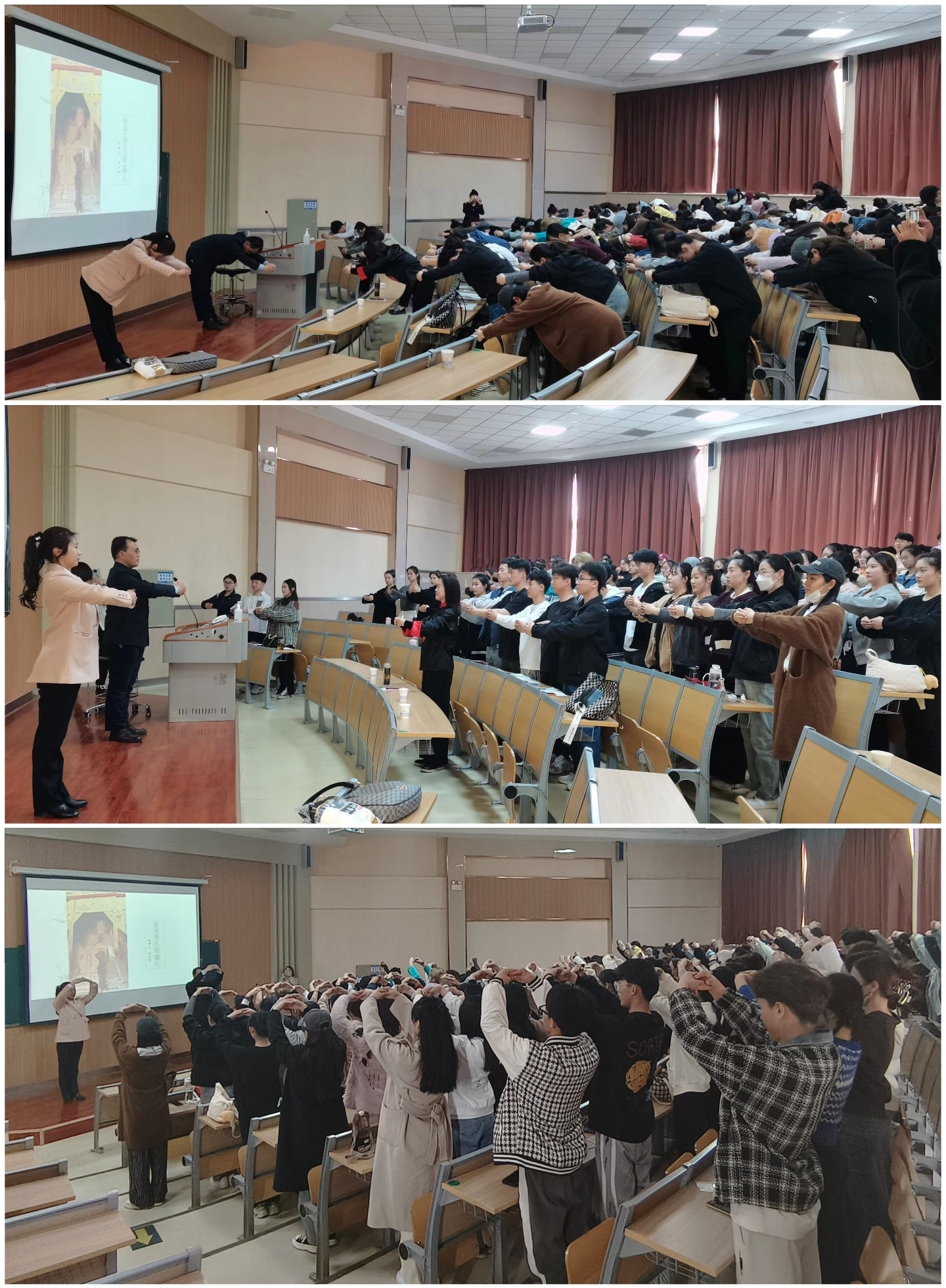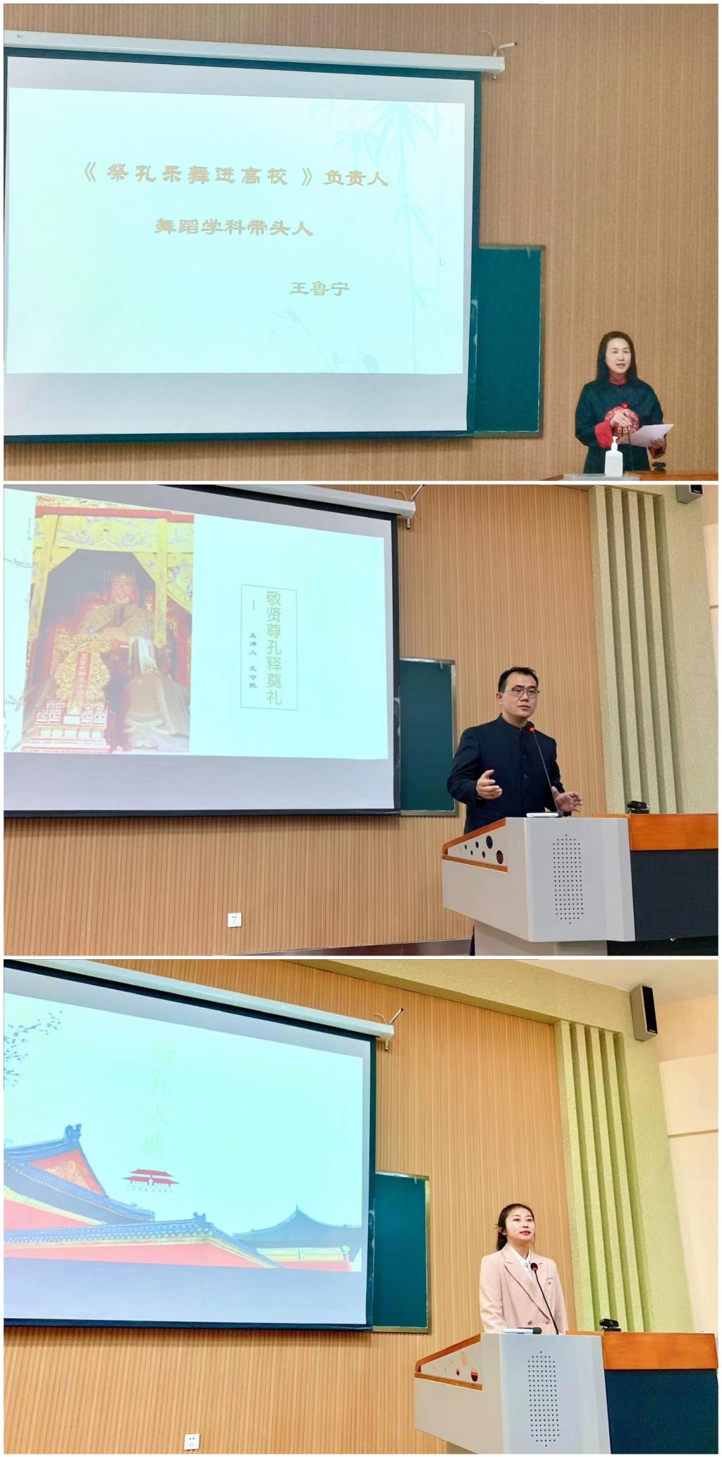 近日,我校与济宁孔子文化旅游集团签订了战略合作框架协议,音乐学院积极推进对接,开启了《祭孔乐舞走进高校》的系列活动,特此感谢曲阜三孔文化旅游服务有限责任公司的董事长颜涛和副总经理张磊。3月6日,我院邀请了曲阜三孔文旅演艺部的孔令凯和晏清老师为我们讲授祭孔乐舞系列课程。开课仪式由舞蹈教研室主任石晓蕾主持,音乐学院党委书记徐俊凯、办公室主任王凯、舞蹈学科带头人王鲁宁、舞蹈教师孙宪鑫出席了课堂启动仪式。音乐学院舞蹈专业141名学生聆听了首次授课。