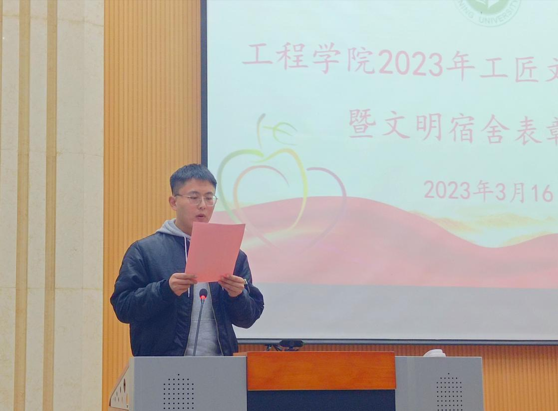 工程学院学生会执行主席吕丰泰宣读了工程学院“文明宿舍”表彰决定,他希望受表彰宿舍的同学再接再厉,充分发挥榜样和示范作用,努力营造“安全、文明、整洁、舒适”的生活和学习环境,为校园文明建设作出新的贡献,并邀请颁奖嘉宾为获奖宿舍代表颁奖留念。