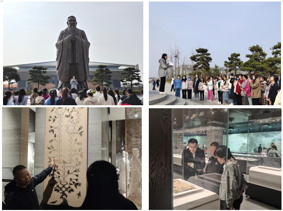 下午两点,师生集合完毕,从学校东门出发,步行前往孔子博物馆。到达目的地后,参加游学实践的同学,首先在孔子博物馆门前的孔子雕像下听取了大学生孔孟文化研究会会长郑欣雨关于孔子生平的介绍。然后在老师带领下进行参馆学习。博物馆拥有各类馆藏文物70万件,孔府私家文书档案30万件、宋代以来善本古书4万多册、明清衣冠服饰8000多件。同学们遨游其中,与先贤对话,感受儒家文化魅力,见证中国历史的发展和变迁。