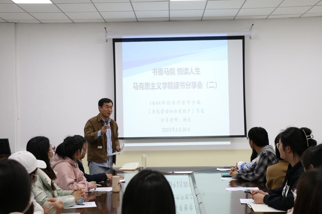 读原著、学原文、悟原理,是党的理论武装工作的优良传统。3月30日晚,马克思主义学院举办了第二期读书分享会,邀请我院杨光老师分享《1844年经济学哲学手稿(节选)异化劳动和私有财产》。姚海生老师、王款老师,中国化马克思主义读书协会成员、马克思主义学院部分读书爱好者参加分享会,活动由姚海生主持。