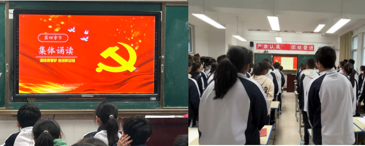 四是激扬青春梦,奋进新征程。全体学生起立,在老师的领读下,集体诵读习近平总书记2022年10月16日在中国共产党第二十次全国代表大会上的报告关于青年的论述。学生们激情澎湃,声音洪亮,彰显青春活力。