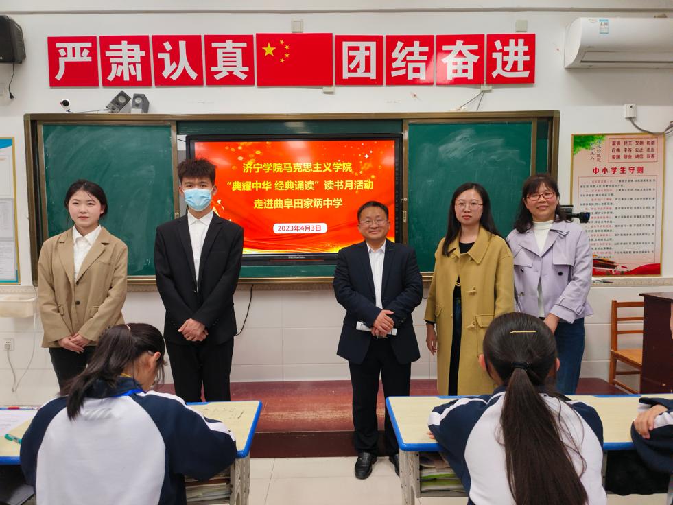 为激励青少年学生养成爱读书、读好书、善读书的习惯,形成浓厚的读书氛围,增强学生历史自觉和文化自信,进而推进大中小学思政课一体化建设,4月3日,马克思主义学院“典耀中华 经典诵读”读书月活动走进曲阜田家炳中学,和学生们一起诵读经典。
