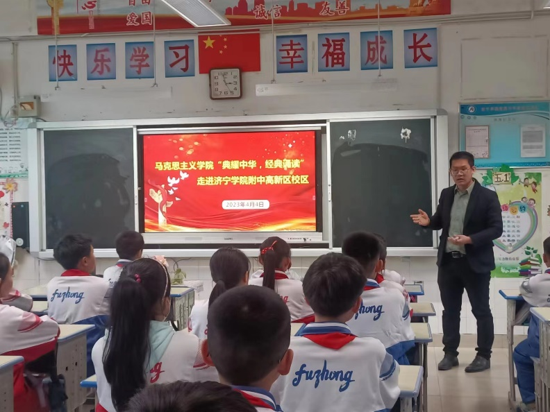 为引导激励青少年学生爱读书、读好书、善读书、立志为中华民族伟大复兴而读书,切实增强历史自觉和文化自信,进而推进大中小学思政课一体化建设,4月4日,马克思主义学院“典耀中华 经典诵读”读书月活动走进亚星在线登录官网附属中学和学生们一起诵读经典。
