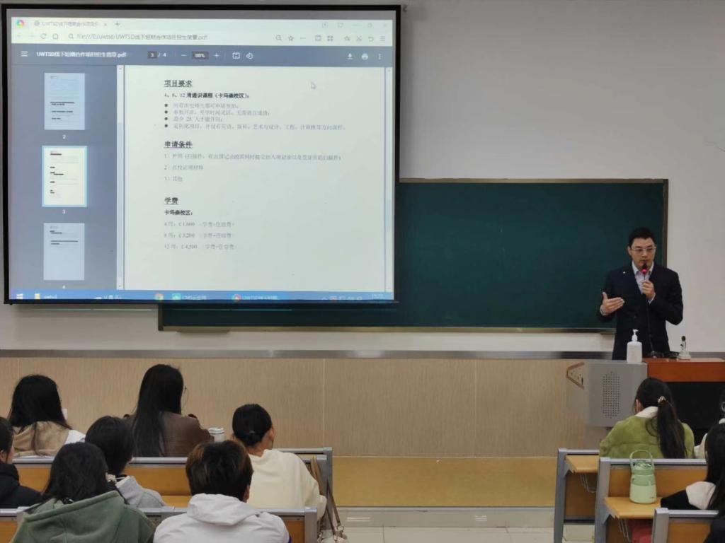 李刚首先对赴英学分交流计划和暑期赴美带薪实习做了简单的介绍,英国威尔士三一圣大卫大学将面向英语相关专业学生开展学期学分交流计划,此次赴英学分计划可在专业课学习的同时提升英语学习能力,感受原汁原味的英国课堂和国际化教学魅力,以及体验英国大学校园文化,认知英国文化与社会。