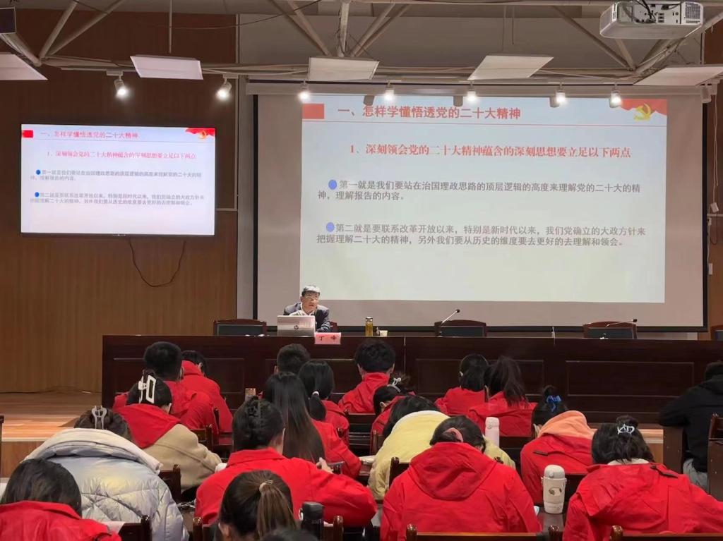 中共英吉沙党校(行政学校)副教授丁峰对党的二十大报告进行了深入解读,他从“新时代十年成就推动我国迈上新征程”“新时代新征程面临的机遇和挑战”“开辟马克思主义中国化时代化新境界”“以中国式现代化全面推进中华民族伟大复兴”和“以党的自我革命引领社会革命”五个方面,对党的二十大报告作深刻分析,同时还紧密联系地方发展实际、联系广大援疆干部、人才、师生的思想和工作实际进行讲解,为援疆人员学习贯彻落实党的二十大精神,更好地开展援疆工作、铸牢中华民族共同体意识提供强大的思想力量。