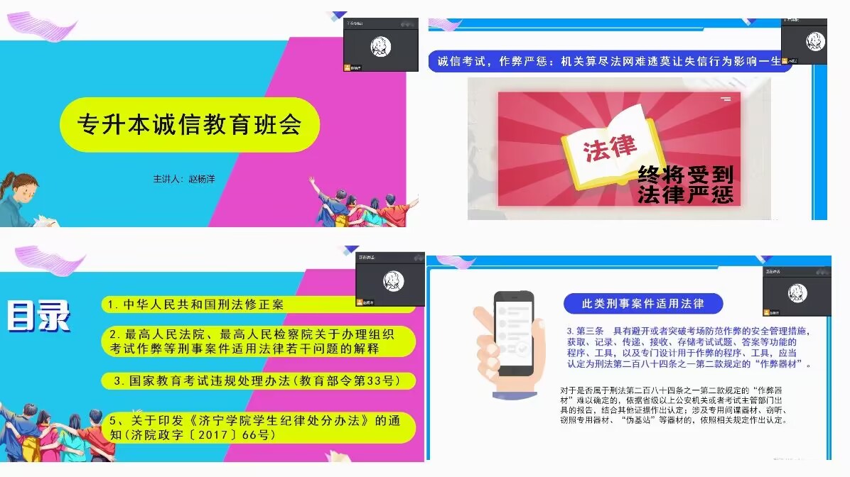 为保障2023年专升本招生考试工作的开展,确保考生诚信应考,4月11日下午,物理科学与智能工程学院辅导员赵杨洋为电子信息工程技术专业全体专升本考生召开诚信教育主题班会。