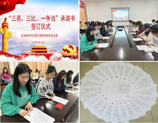 一笔一划写下初心,一心一意履行职责,一字一句郑重承诺。近日,在生命科学与生物工程学院会议室开展了“三两三比一争当”活动承诺书签定仪式,本次活动由学生第一党支部书记张丽翠主持。会上,张丽翠提出,全体党员要充分认识到开展“三亮三比一争当”活动的重要性和必要性,积极履职尽责,展现新形象,彰显新作为,希望全体师生党员能够以身作则,在平凡的岗位上践行初心与使命;随后,教师党员代表翟肖肖和学生党员代表郭祺分别宣读了活动承诺书,表示要努力做一名让人民满意的新时代“四有”好老师和青年大学生;最后,全体党员共同签订了“三亮三比一争当”承诺书并按下了红色手印,表示一定会遵守党章党规,并努力实践诺言,立足本职、做出表率、真抓实干、干出实效,为党旗添彩。