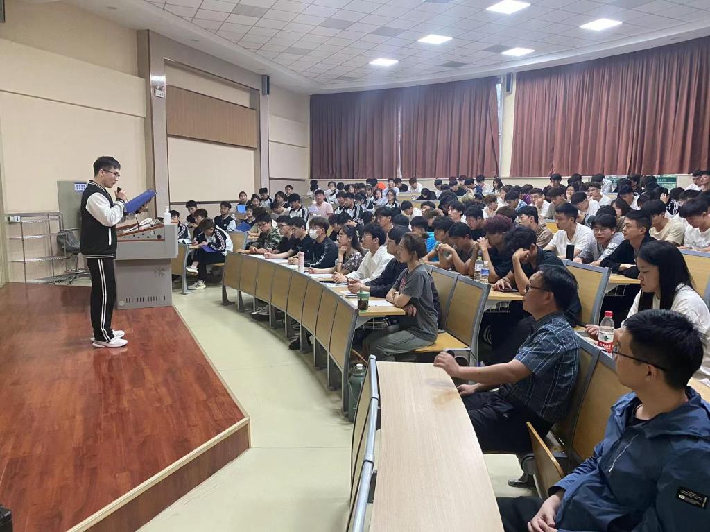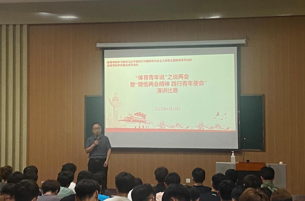 为认真学习、领悟两会精神,坚定青年学子理想信念,4月19日,体育学院在4号楼B101举办“体育青年说”之“领悟两会精神 践行青年使命”主题演讲比赛。学院党委副书记辛允东、辅导员张新昊及2022级全体学生参加活动。