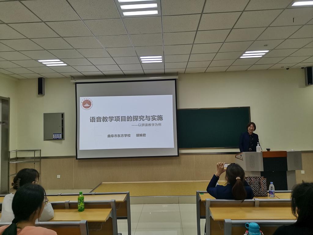 4月20日晚,外国语学院邀请曲阜市东方学校英语学科主任胡婉君老师在3号楼C101作了题为“语音教学项目的探究与实施 ”的讲座。讲座由外国语学院党委副书记文灿主持,曲阜市东方学校德育部主任杜冉冉,部分教师代表,2021级、2022级本专科英语师范专业学生参加了此次活动。
