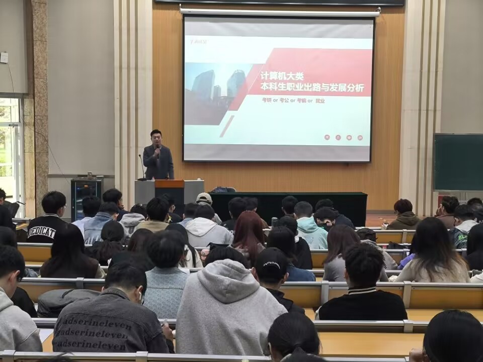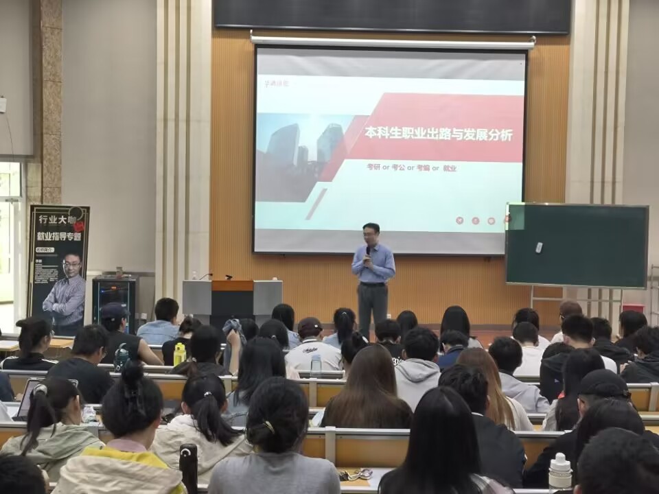 20日上午,李鹏为软件工程、虚拟现实、应用统计学、数据分析等六个专业的五百余名同学授课。21日上午,由袁文建为来自网络安全、网络优化、智能物联、云计算等六个专业的五百余名同学授课。二位讲师从大学生的未来职业选择、考公考研就业出路、就业前景和岗位需求等方面切入,分析学院不同专业学子的职业出路和发展道路,阐述行业发展趋势及人才需求,分析本科生面临的竞争压力和发展机遇,帮助大三学子全面、清晰地认知就业形势,综合考量自身学习能力和发展空间,确立合理的职业定位和职业目标,提前部署、打牢基础,牢牢把握每一次就业机遇,重视自己的每一次选择,努力成为行业的可用之才和优秀人才。二位讲师在讲解中分享多个真实的就业案例,鼓励同学们加强自身能力提升,为自己确立更好的职业生涯和发展路线。幽默风趣的讲解、犀利独到的见解,引得现场掌声阵阵。同学们精神饱满,与老师积极互动,取得了良好效果。
