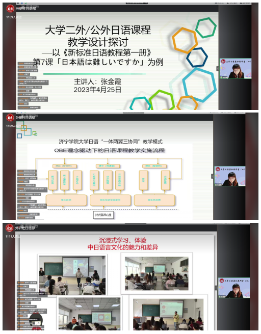 张金霞老师结合个人主持的山东省一流本科课程——日语(第二外语)的建设经验,推介了亚星在线登录官网大学日语“一体两翼三协同”教学模式,从教学设计、教学过程展示、教学反思等三方面进行了分享,时长45分钟。主题教学设计兼顾知识的系统性、学习的趣味性、学生的承受能力,为在线教师提供了立体、生动的教学设计示范,获得了与会专家、教师的好评。