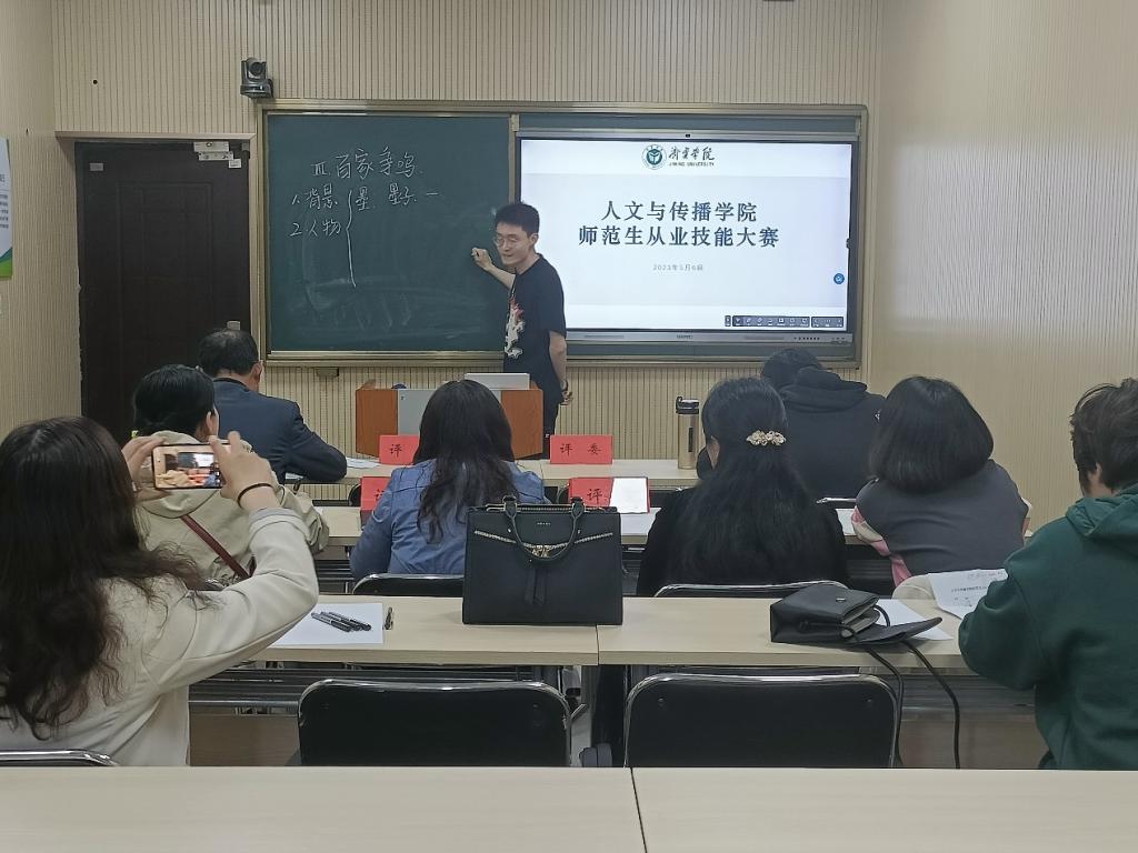 为提升师范类专业学生的从业技能和综合素质,以赛促学、以赛促练,做好第十一届山东省师范类高校学生从业技能大赛选手推选工作,人文与传播学院于近日开展2023年师范生从业技能大赛决赛。孟冬梅、孔莉、谢经虎等9位老师担任大赛评委。