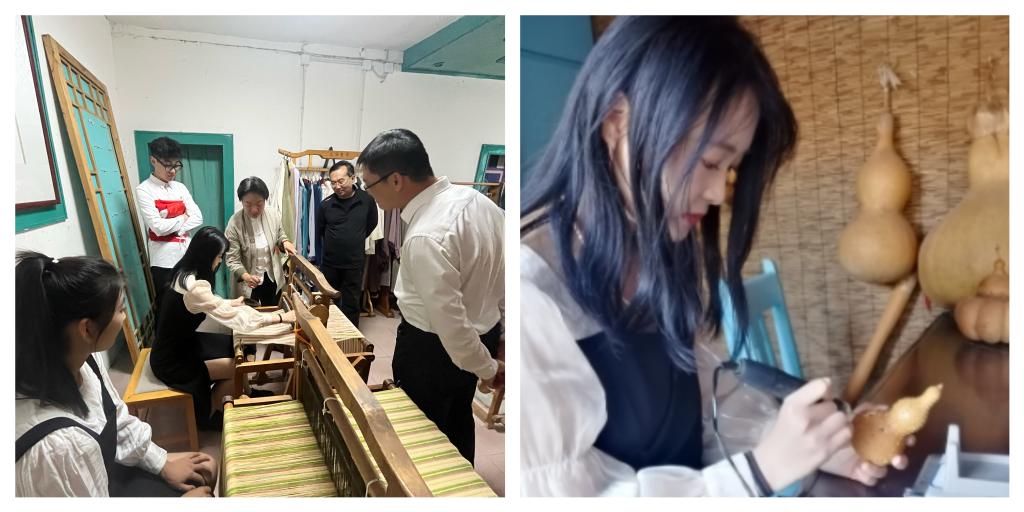 首先,大家进行了非遗文化体验。经纬鲁锦,书写华章,鲁锦传承人郝秋霞向大家介绍了鲁锦的织造工艺,经线、闯杼、掏缯等主要工序,同学们进行了生动的传统手工织布体验,从中领略“非遗”之美。葫芦雕刻,妙趣横生,葫芦雕刻种类和工艺非常丰富,几百年来不断发展兴盛,极富美学魅力,同学们参观了手工葫芦灯,并亲手感受了葫芦的雕刻方法。