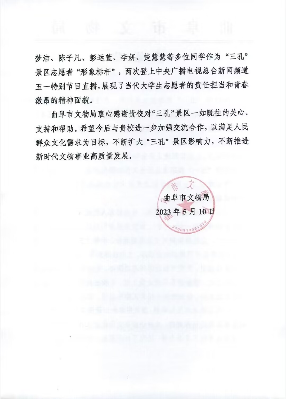 感谢信中曲阜文物局对学院志愿者团队工作给予高度认可,并表示将进一步与学校加强交流与合作,校地协同共同践行中华优秀传统文化“两创”,以不断满足人民群众文化需求为目标,持续推进新时代文物事业高质量发展。