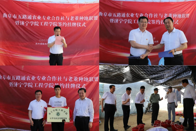 5月13日,工程学院与曲阜市五路通农业专业合作社暨老董种地联盟大学生社会实践基地签约挂牌仪式、工程学院学生党支部与峪西村党支部党建共建签约仪式在峪西村举行。曲阜市委常委、人武部部长范广强,市职业中等专业学校党委书记王玉栋,老董种地联盟董事长董永泽,工程学院党委副书记许言强,吴村镇党委书记刘卓然出席,峪西村党支部书记李含参加活动。