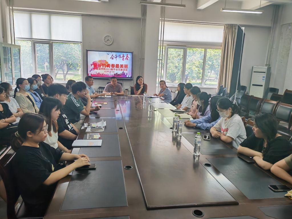 5月18日下午,外国语学院在三号楼一楼会议室召开毕业生代表座谈会,该院党委书记陆波,副书记文灿,毕业班辅导员及2023届毕业生代表参加,会议由辅导员张磊主持。