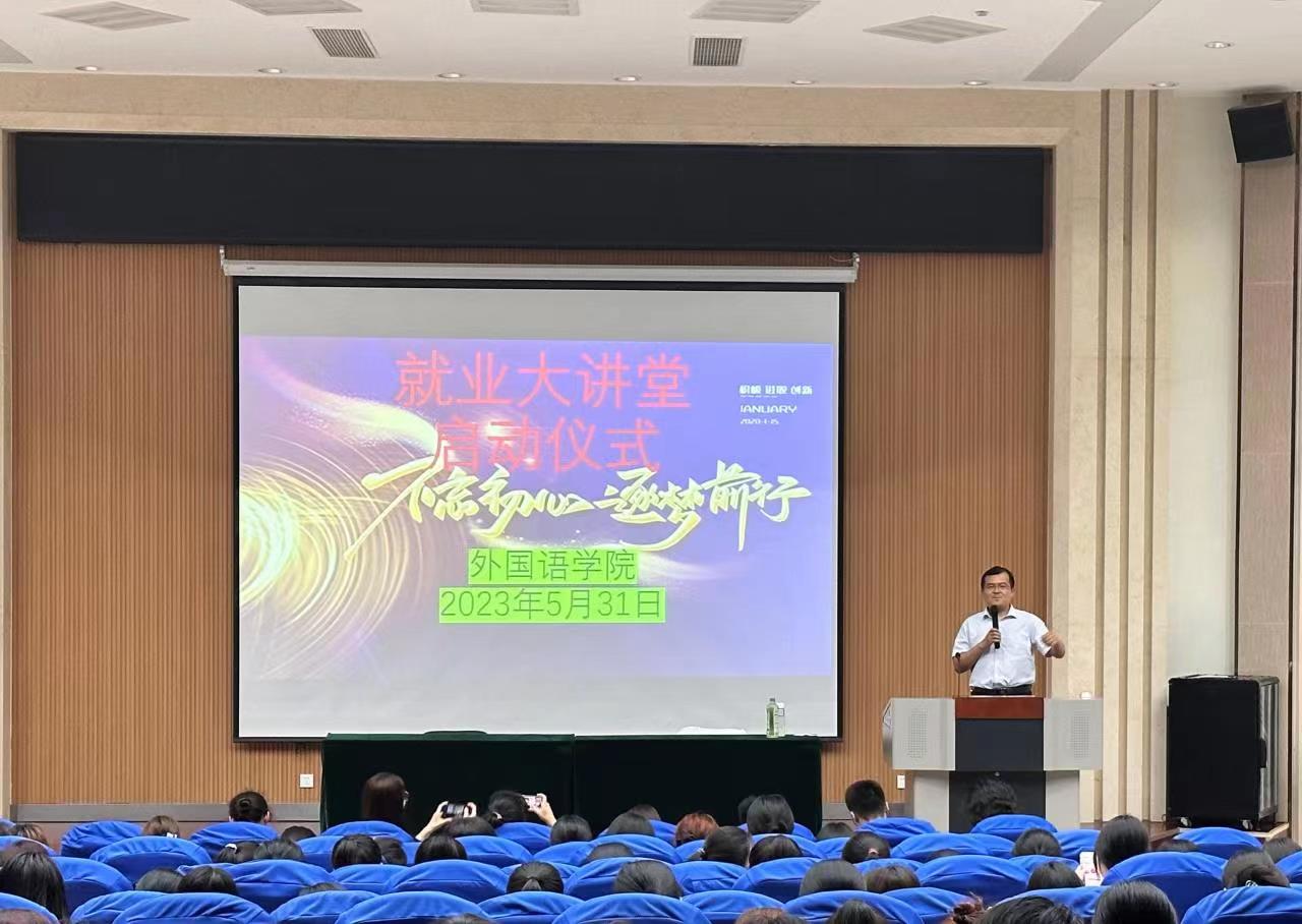 为更好地应对当前的就业形势,提高学生就业综合素质,帮助同学们积累求职经验,为未来就业求职做好充分的准备,外国语学院决定开办“就业大讲堂”。5月31日晚,举行了“就业大讲堂”活动启动仪式,各年级五百余名学生参加,活动由辅导员张磊主持。