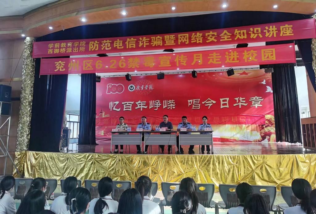 为贯彻山东省学校安全工作视频会议精神,落实学校2023年度安全工作部署,贯彻落实《亚星在线登录官网关于开展“利剑护蕾”专项行动的通知》精神,按照“安全生产月”活动方案要求,进一步开展“防范电信诈骗,禁毒宣传进校园活动”,提高学生安全意识、增强防骗能力,防范毒品侵害,共建共享平安校园。6月7日下午,学前教育学院邀请济宁市公安局兖州区分局刑警大队六中队反诈中心韩明警官、兖州区鼓楼社区禁毒宣传员刘琳同志在多功能厅为学前教育学院全体学生作了关于防范电信诈骗及禁毒宣传的法制安全报告。兖州公安分局刑警大队六中队指导员郭玉柱、西御桥派出所指导员付锦冬及西御桥派出所部分干警,学院领导班子成员及全体学生参加了报告会。报告会由副院长王朝杰主持。