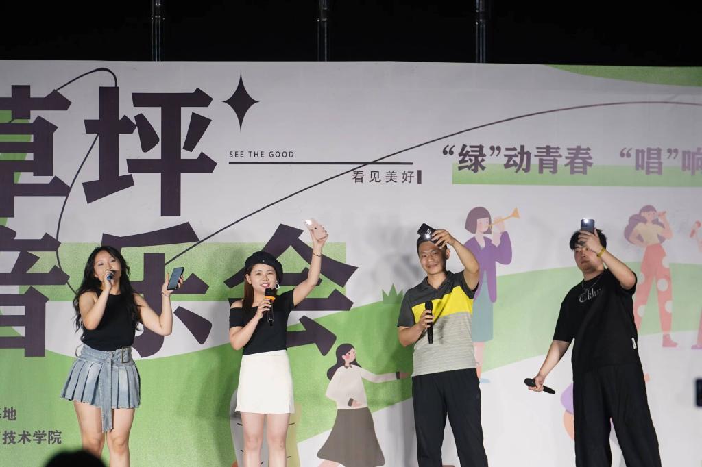 夜幕下,激昂活力的流行音乐,带动全场合唱;激情四射的舞蹈,点燃观众的热情;安静温柔的民谣,让人沉醉其中……为现场观众带来一场视听盛宴。“观众点歌”嗨唱环节现场观众们自由报名上台演唱,将现场活跃值拉满,欢声笑语此起彼伏。晚会接近尾声,带着对毕业学子的祝福,毕业生代表刘一鸣、王培、魏冉献唱歌曲《入海》、《大鱼》,场下欢呼声、掌声不断。辅导员贾春旺、卓硕硕合唱的《凤凰花开的路口》更是引起了全场的大合唱。最后,音乐会在音乐学院乐队演唱的《成都》中落下帷幕。