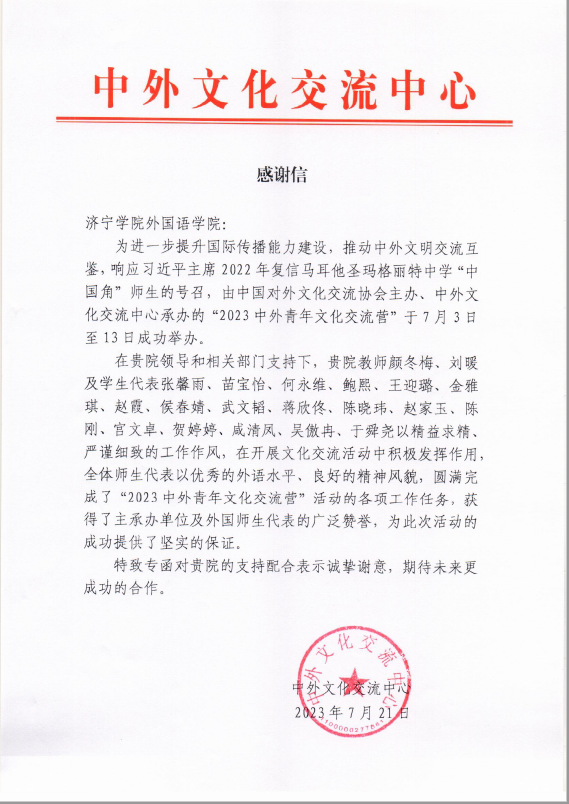 近日,中外文化交流中心给外国语学院发来感谢信,对外国语学院积极参与“2023中外青年文化交流营”各项工作任务表示感谢,对外院师生精益求精、严谨细致的工作作风,优秀的外语水平、良好的精神风貌表示高度赞誉。