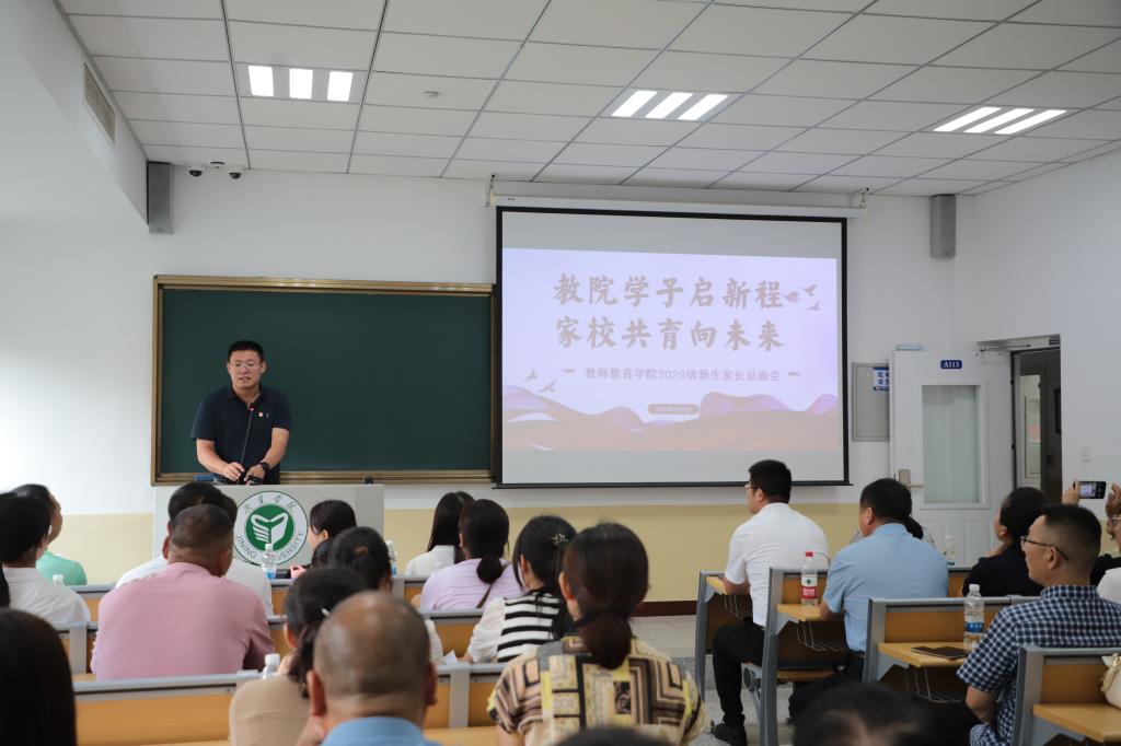为做好家校沟通,推进家校共育,9月9日下午,教师教育学院在2号楼A113召开2023级新生家长见面会。教师教育学院党委书记刘勇、副院长贾英侠、副书记杜鹃、2023级新生辅导员、班主任及新生家长代表参加。见面会由学院团委书记徐艳艳主持。