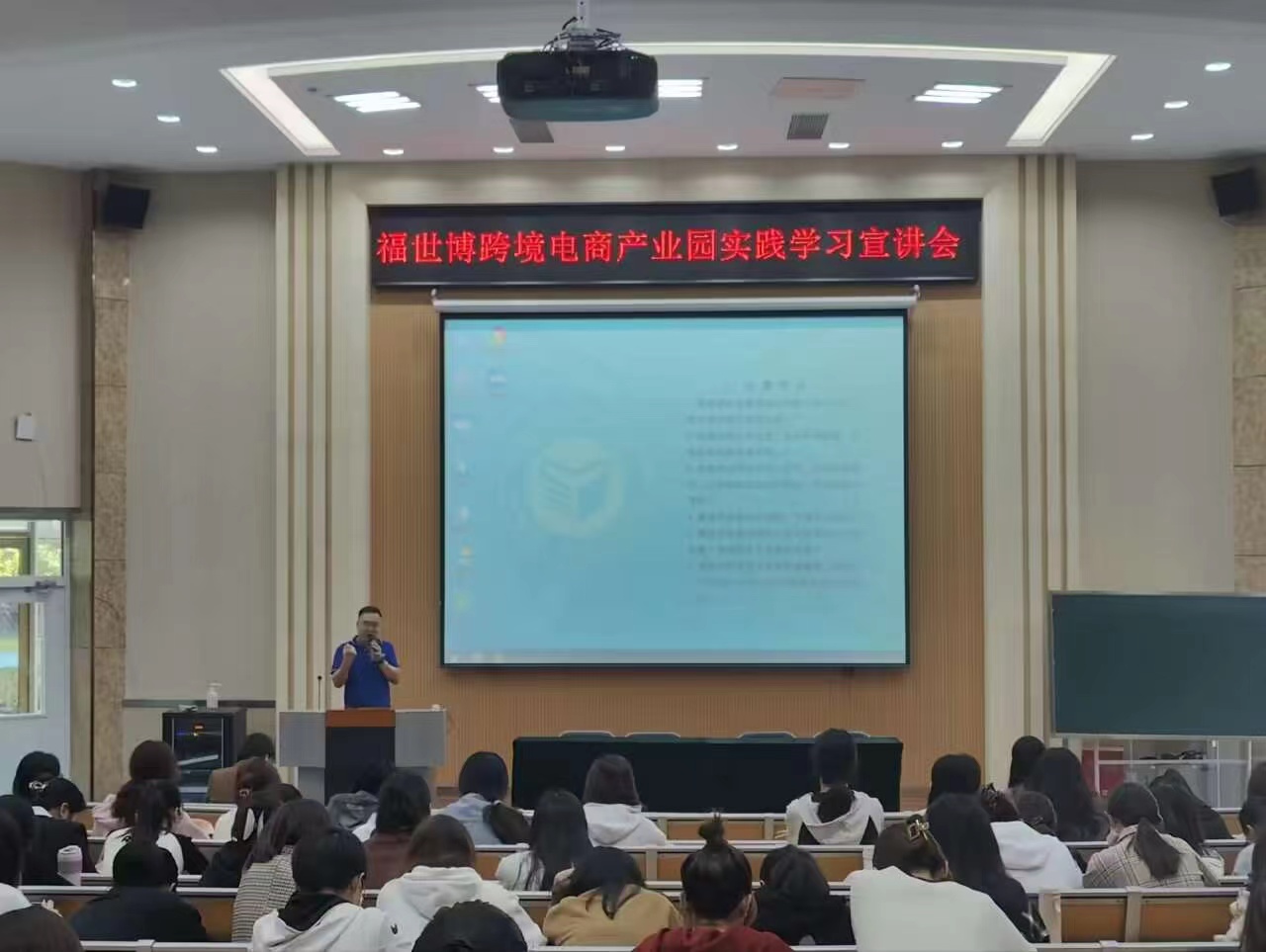 为加深外国语学院商务英语专业的学生对跨境电商这一行业的了解,提高学生的实际操作能力和综合素质,外国语学院于10月9日上午在8号楼报告厅开展了福世博跨境电商产业园实践学习宣讲会。福世博济宁公司负责人王成和园区经理张岩,学院党委副书记文灿、办公室主任闫彩霞、团委副书记姜璨、教研室主任李霄露以及22级全体商务英语专业学生参加了本次宣讲会。