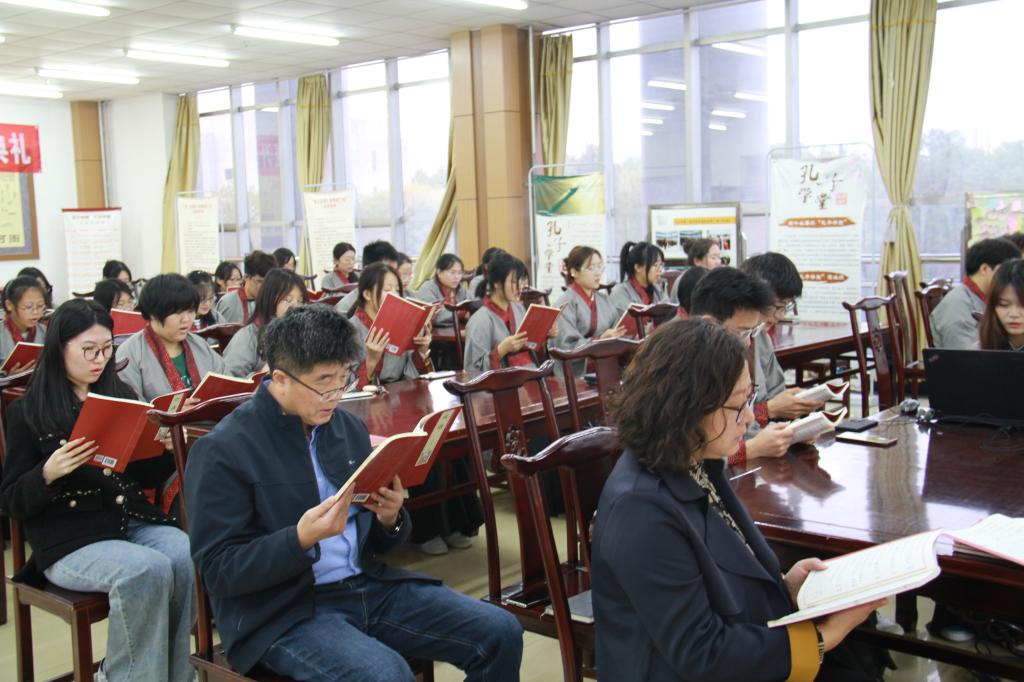 校团委书记张静致辞。她说,我校孔子学堂接续举办系列活动是贯彻落实习近平总书记视察曲阜重要讲话精神的具体体现。她摘取《论语》中的经典名句,将孔子思想与学员们的日常学习、生活相联系,并希望学员们学以致用,真正做到内化于心、外化于行,在经典诵读中不断增进对中华优秀传统文化的理解和领悟。